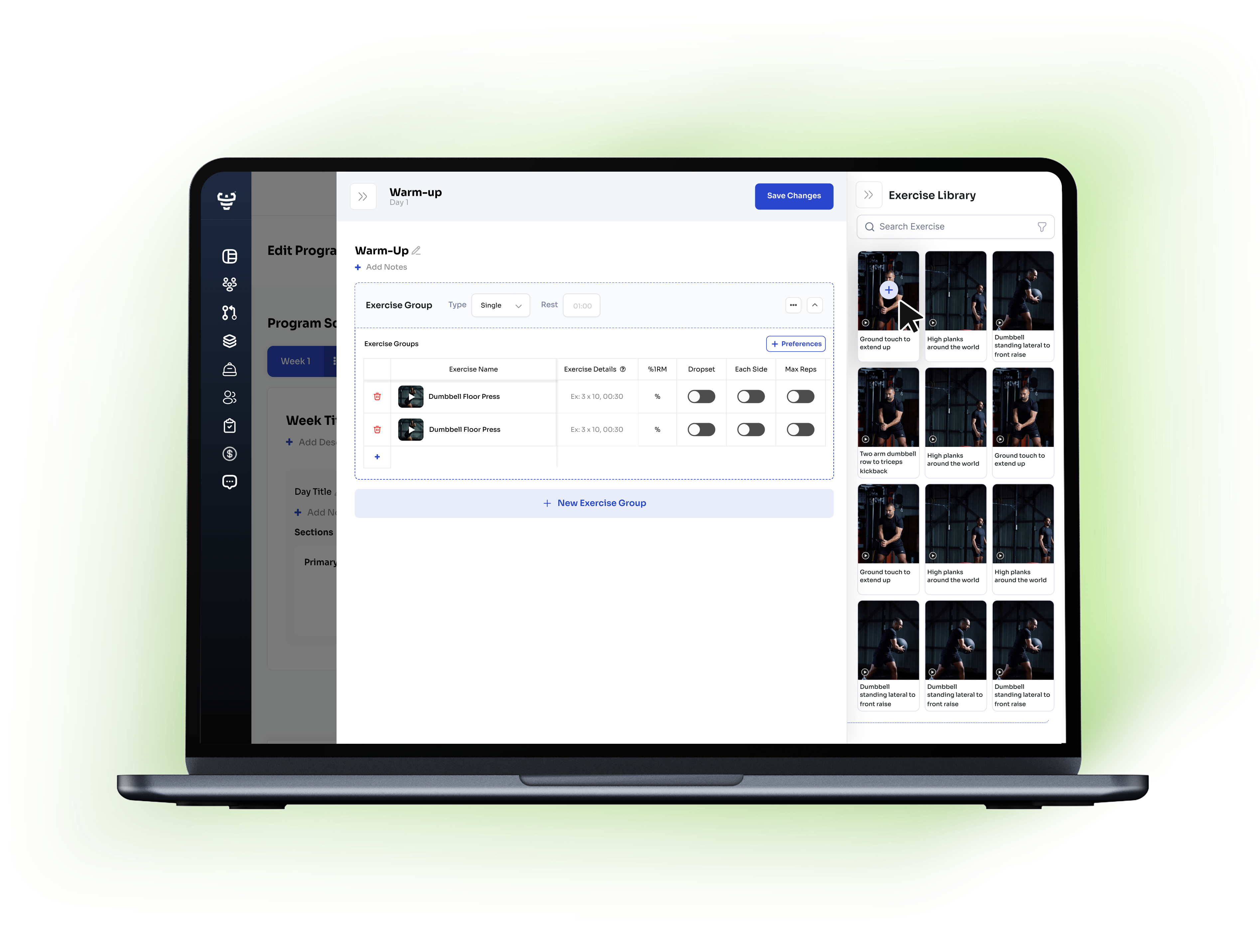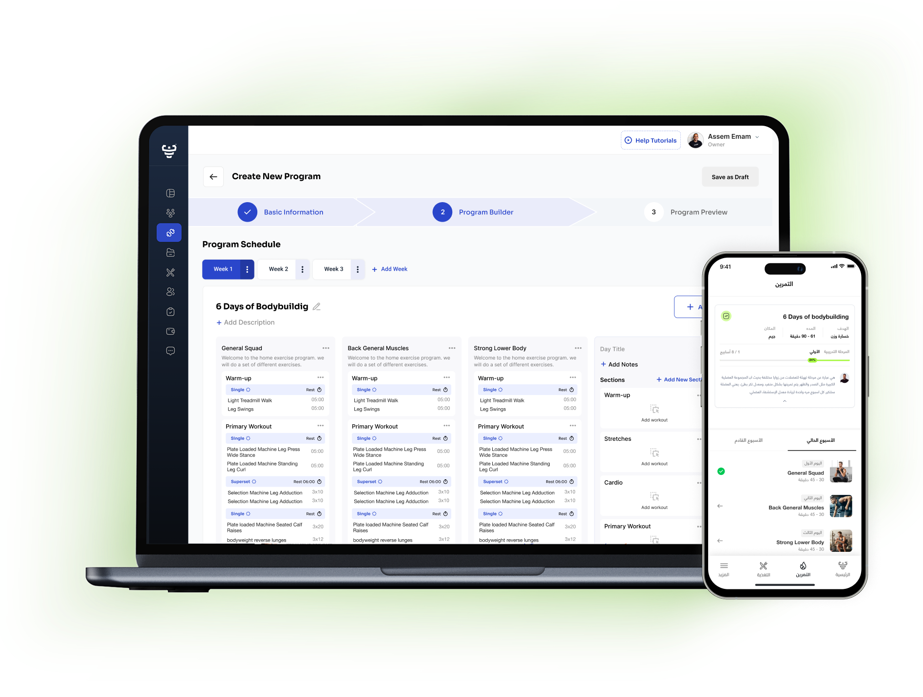 صمّم خطط التمارين بأسلوب تفاعلي سريع — اسحب التمارين، رتّبها كما تشاء، ودع النظام يتولّى الحفظ والتطبيق تلقائيًا.